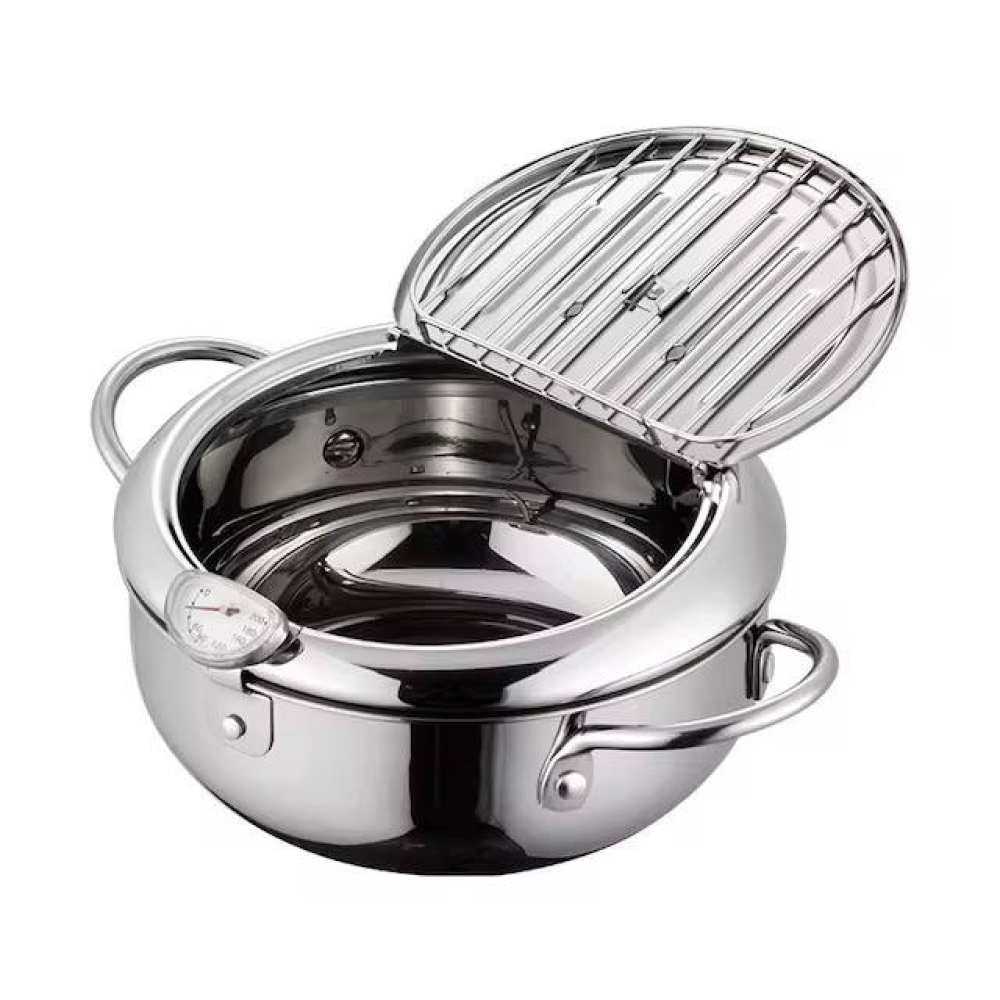 مقلاة عميقة بنمط تقنية القلي اليابانية من الستانلس ستيل 304 مع ميزان حرارة وغطاء ورف تصفية لتقطير الزيت